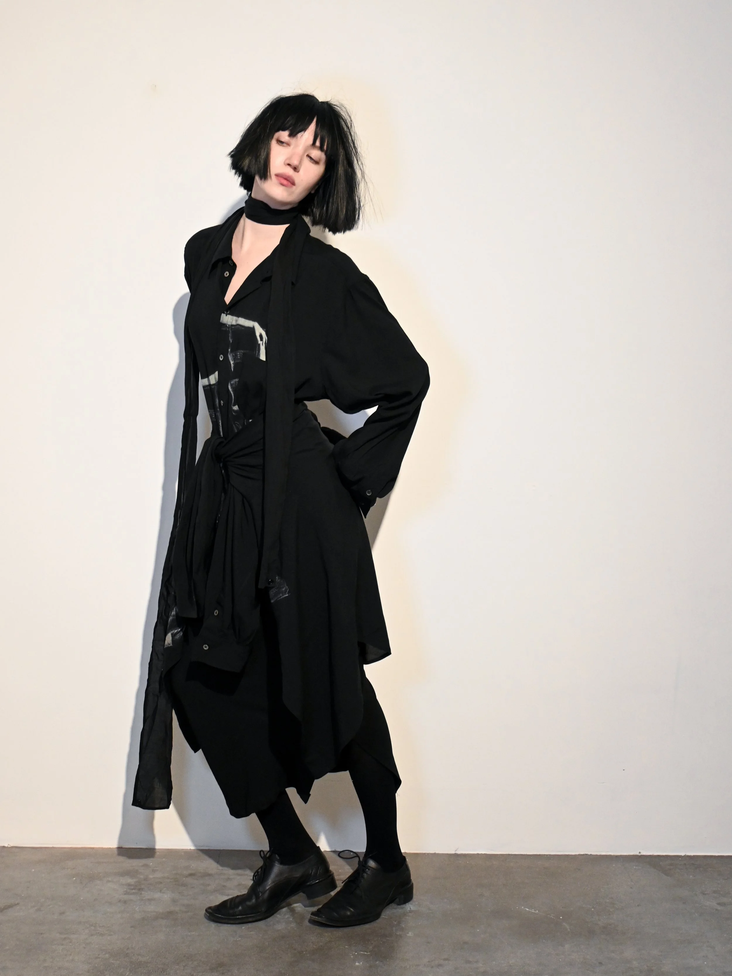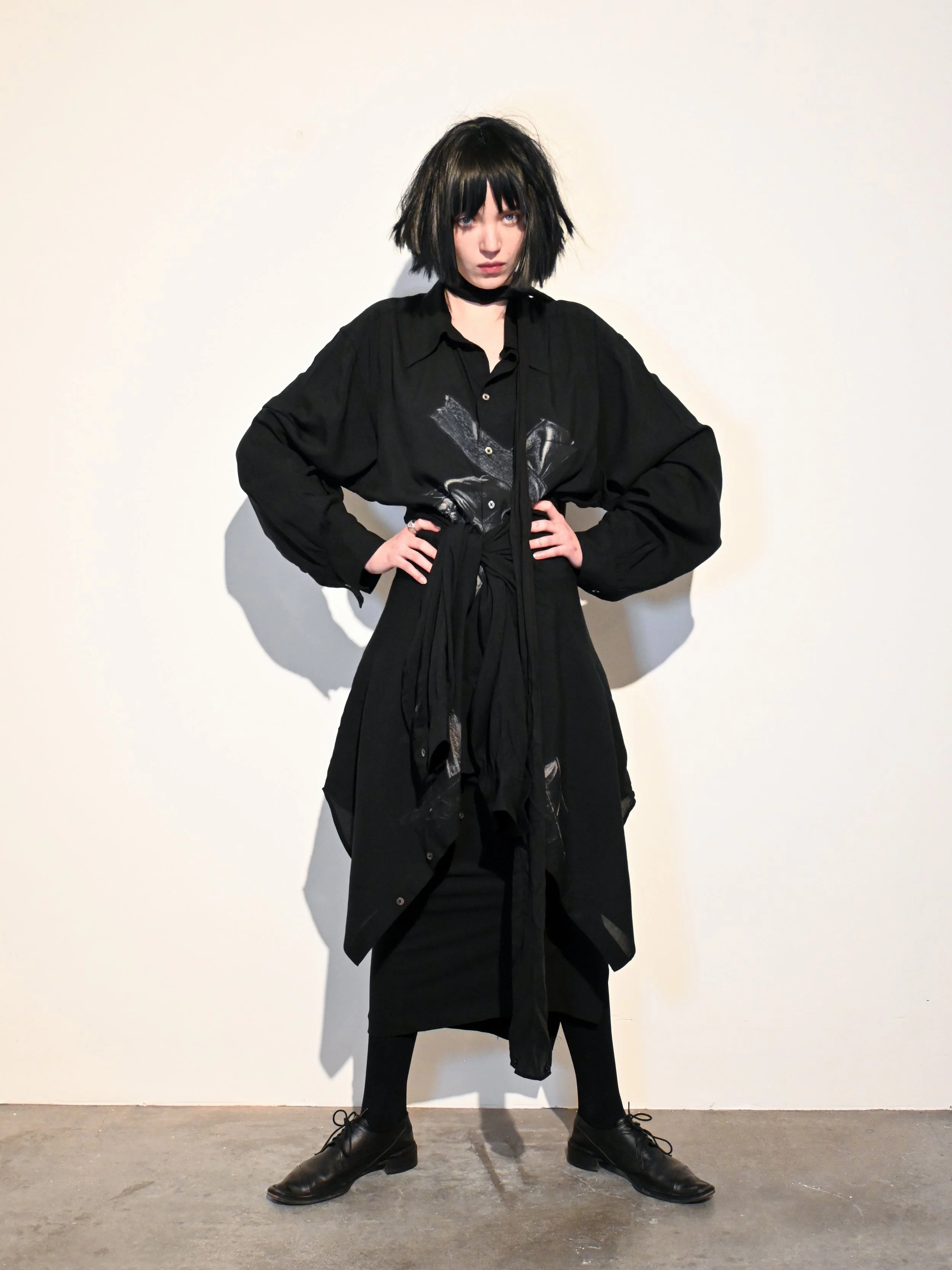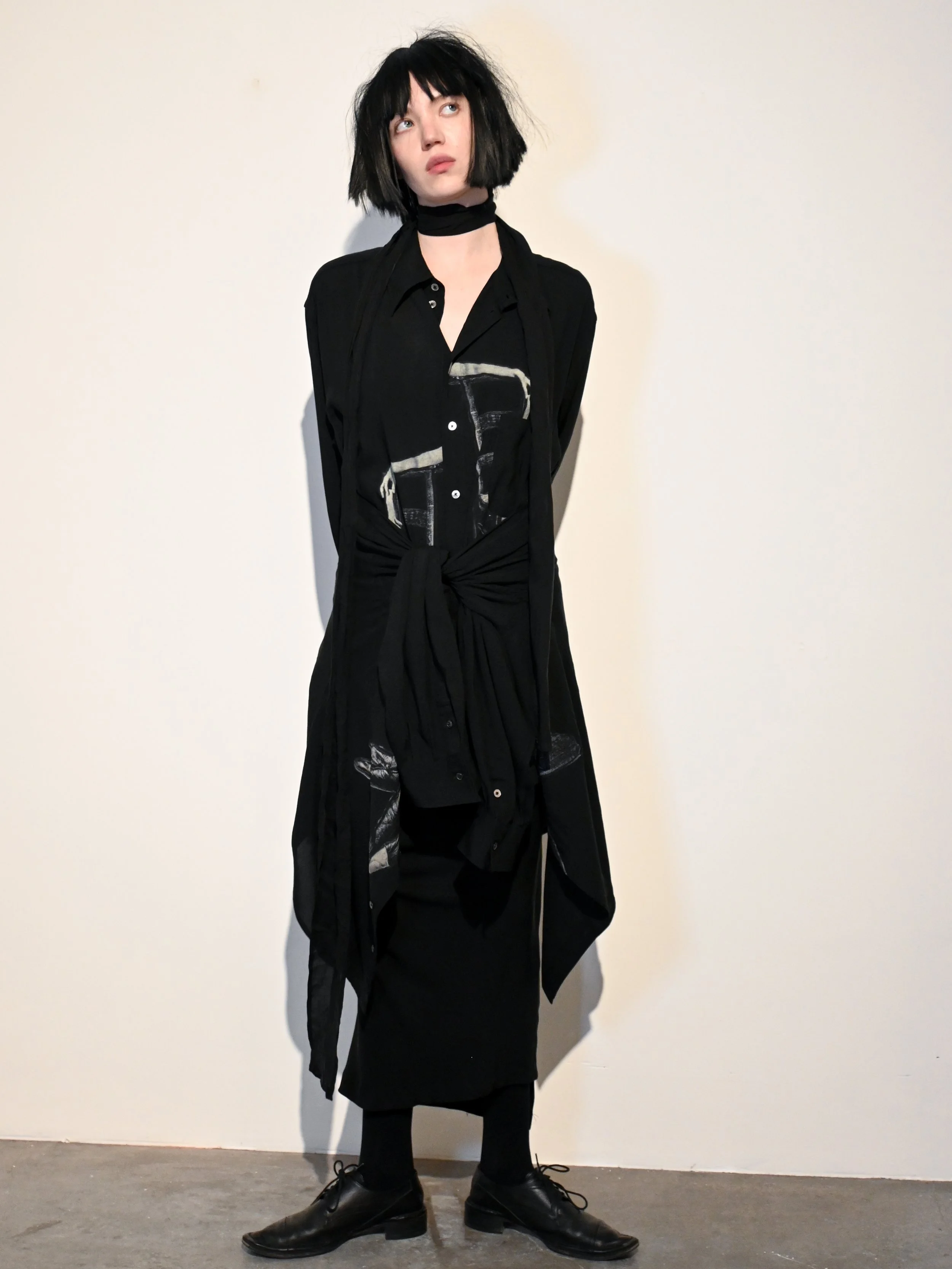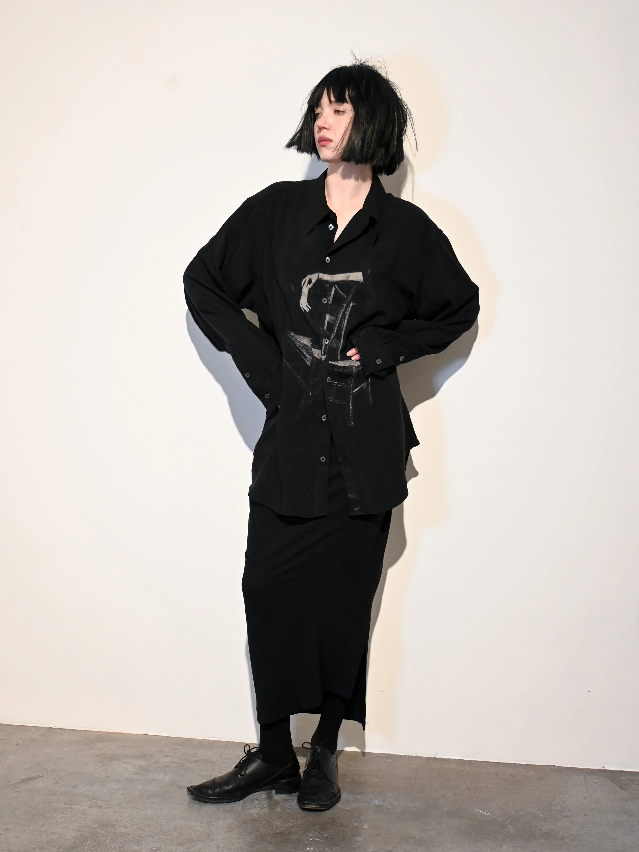 Sourced/produced in Japan by specialized professionals, the printed works employ a rare rayon fabric seldom encountered within European fashion contexts. Precision, material integrity, and meticulous craftsmanship define the production process, reinforcing an ongoing dialogue between artistic expression and wearable form.